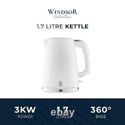 Swan Windsor White 1.7L 3KW Textured Kettle, 2 Slice Toaster & 800W 20L Digital Microwave. Contemporary Matching Kitchen Set with a Premium Sleek White Finish. Swan Windsor 1.7L Textured Kettle White with Silver Handle. Start your day off the right way with a good brew. This Swan SK14611WHT Windsor cordless electric kettle features a textured gloss finish with chrome accents to add subtle contemporary flair to your kitchen.